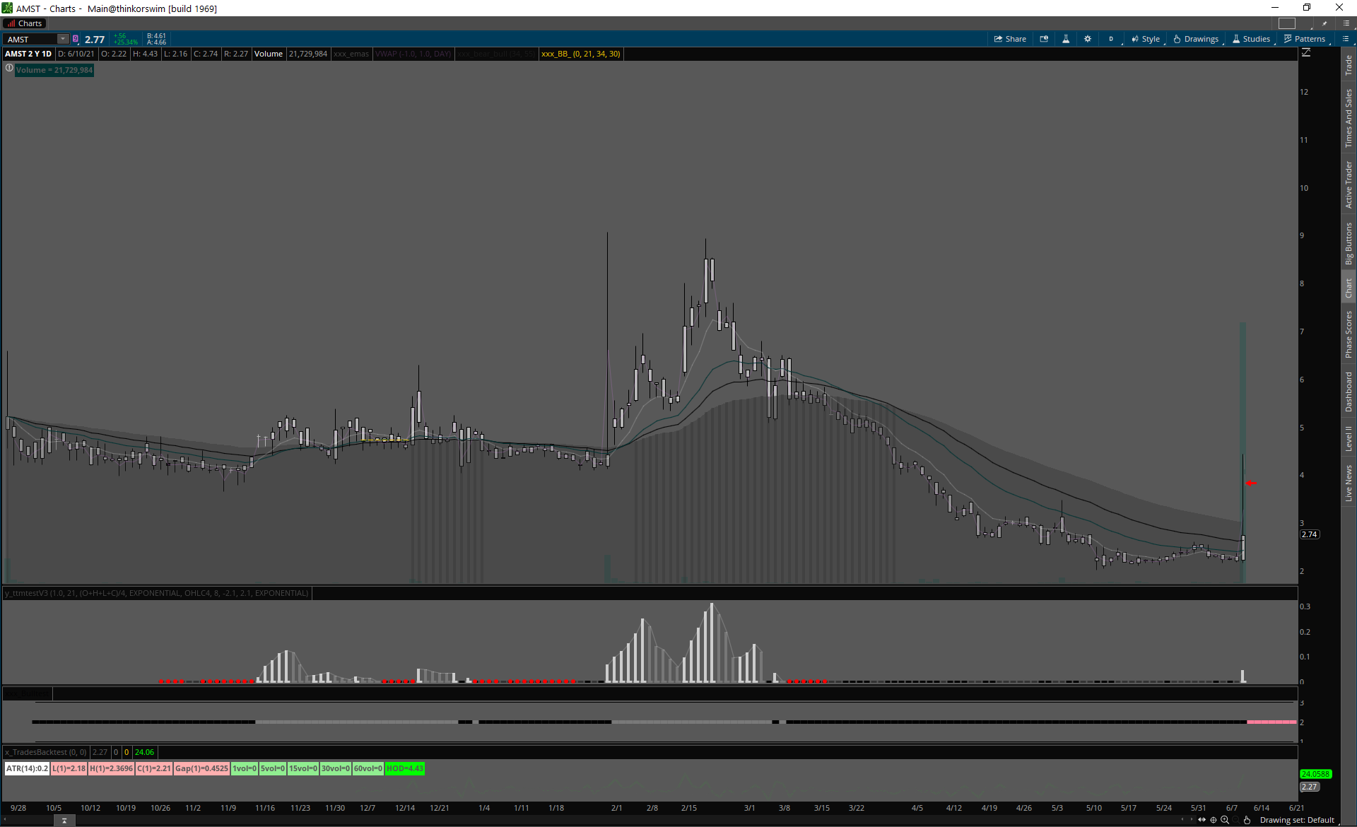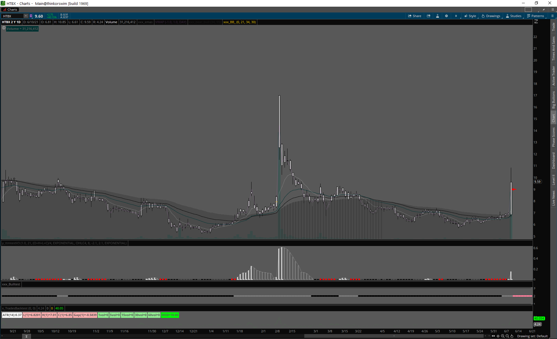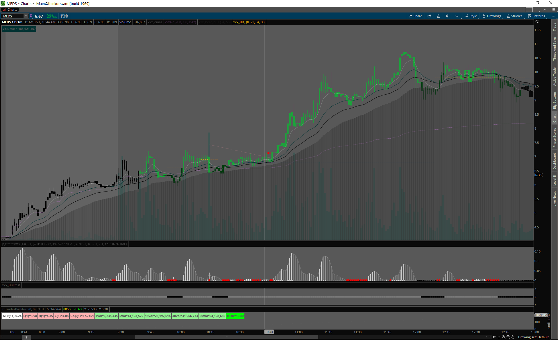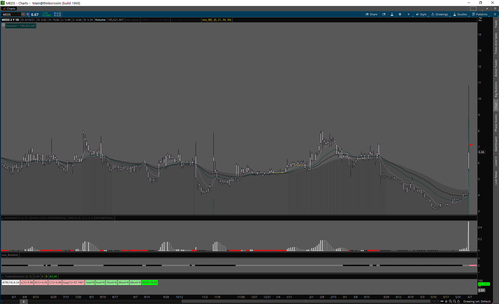MEDS LOW FLOAT, šialené volume, široké spready, nepríjemné “čistiace” candles. Overextended na 15 a 60m od 8ema, veľmi ťažký signál.