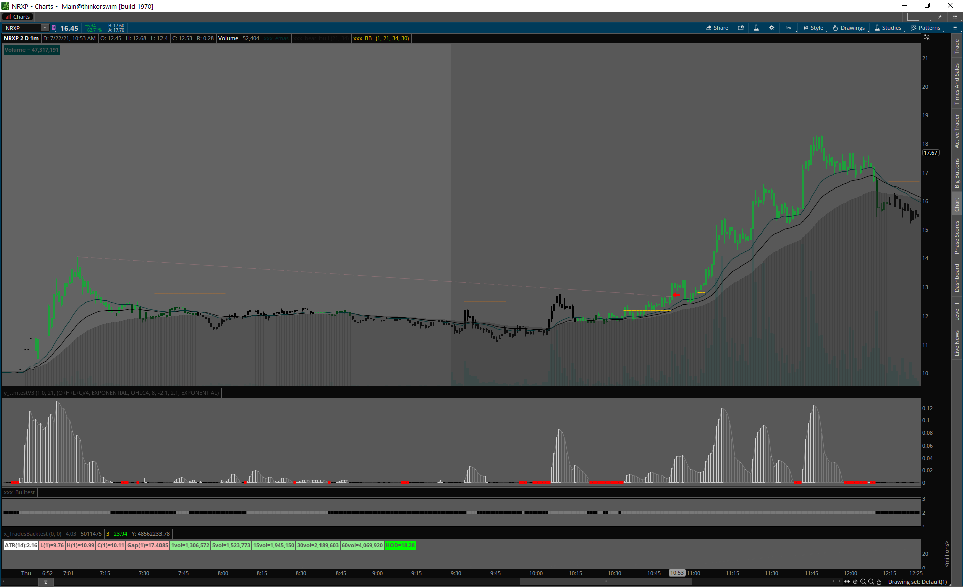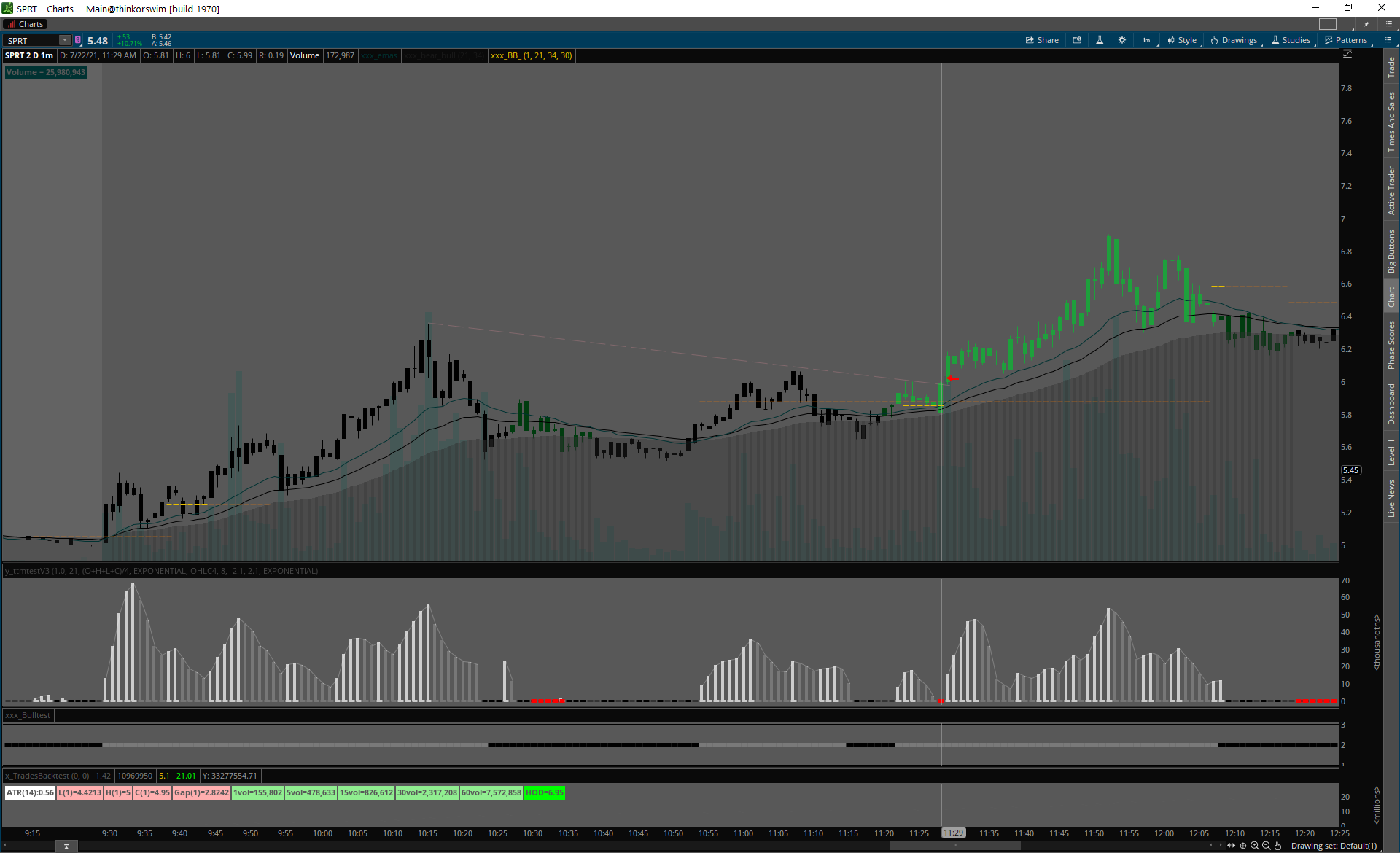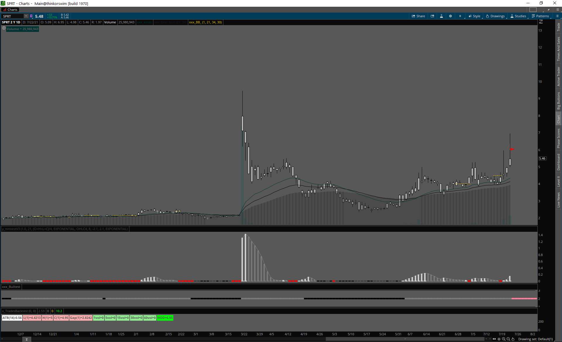 Day 1 spike, squeeze cez predošlý high volume deň highs.