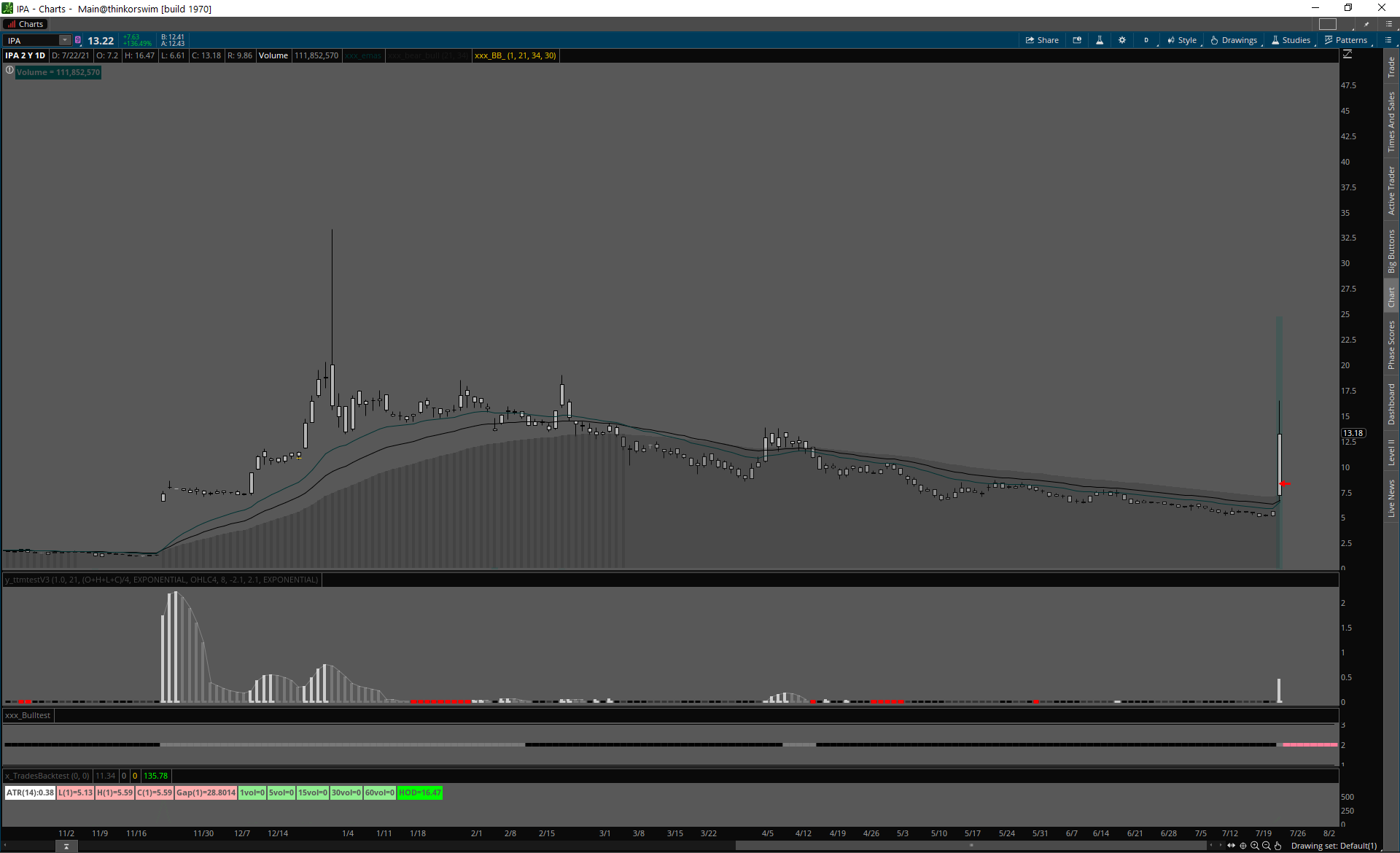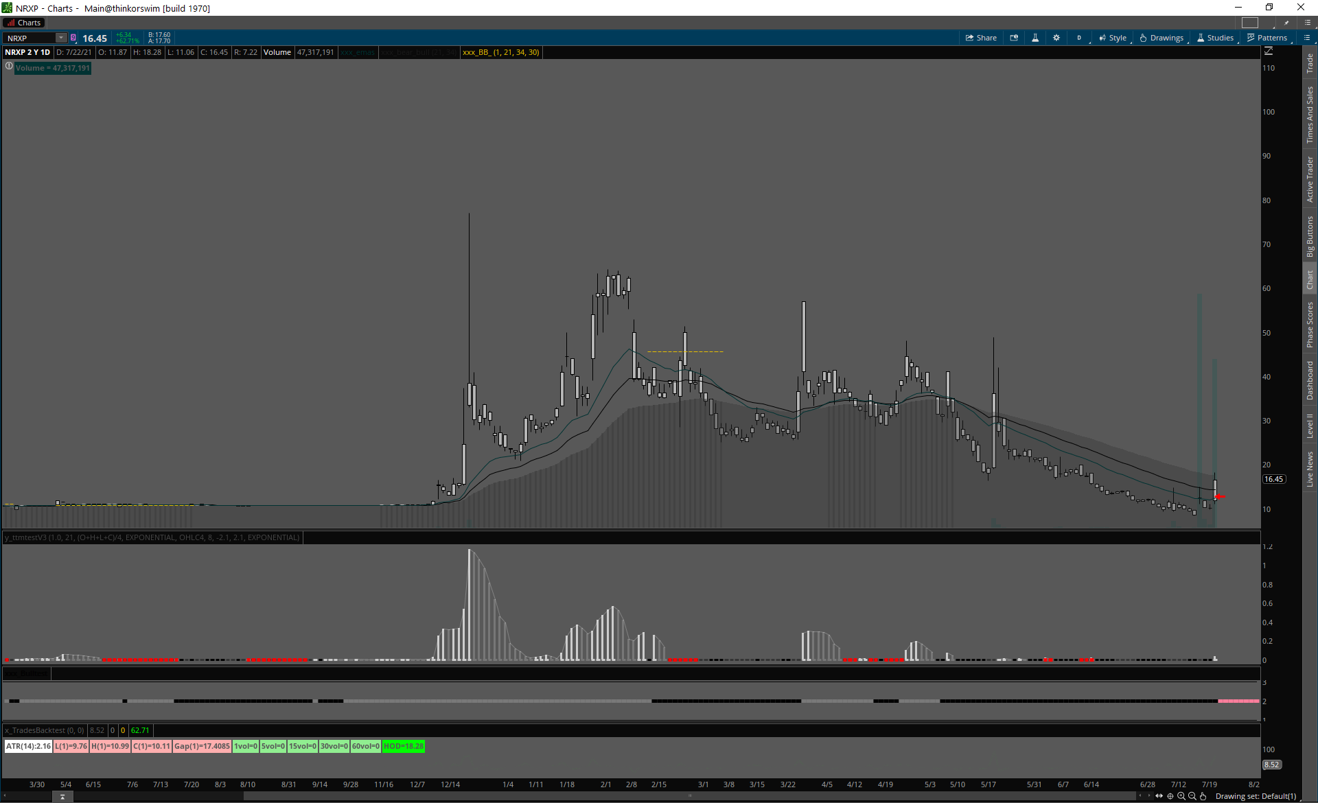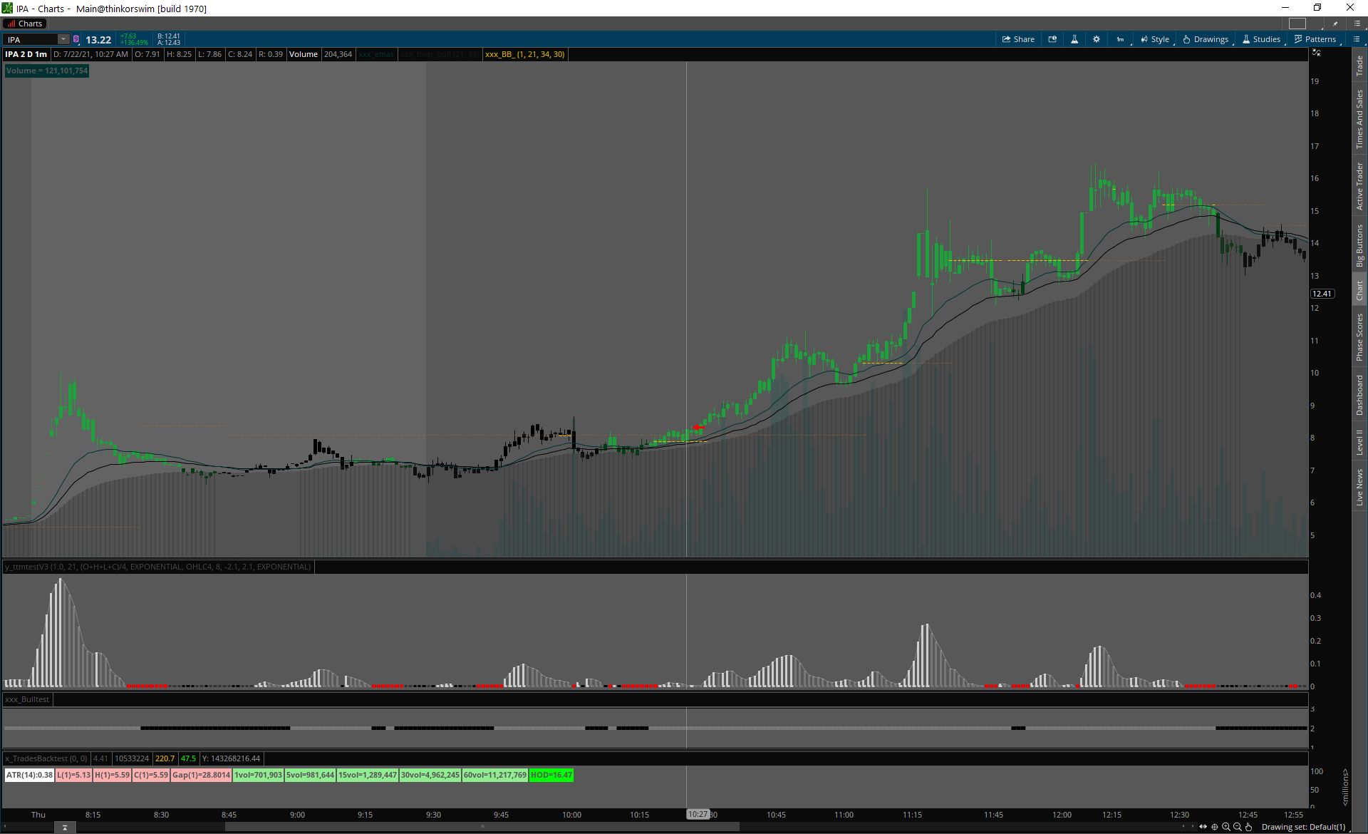 Day 1 spike, squeeze cez predošlý high volume deň highs.